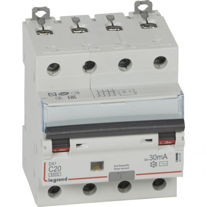 Автоматический выключатель дифференциального тока LEGRAND DX³ 6000 10 кА тип характеристики С 4П 400 В 20 А тип AС 30 мА 4 модуля белый 411187